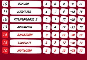 „ბახმარო“ 12 ქულით ( 3 მოგება, 3 ფრე, 13 წაგება, ბ/შ 14:44) მე-15 ადგილზეა.