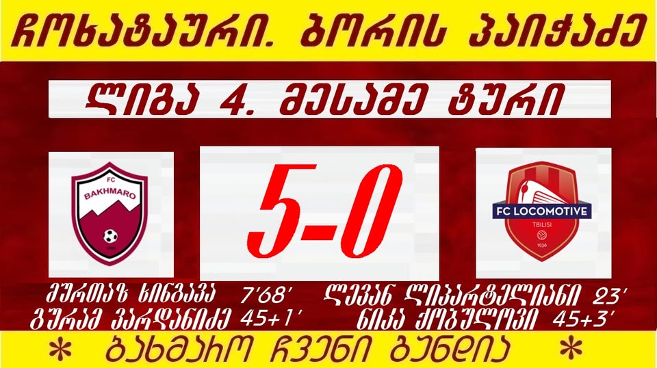 გოლები მურთაზ ხინგავაამ (2), ლევან ლიპარტელიანმა, გურამ ვარდანიძემ და ნიკა ქობულაძემ გაიტანეს.